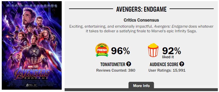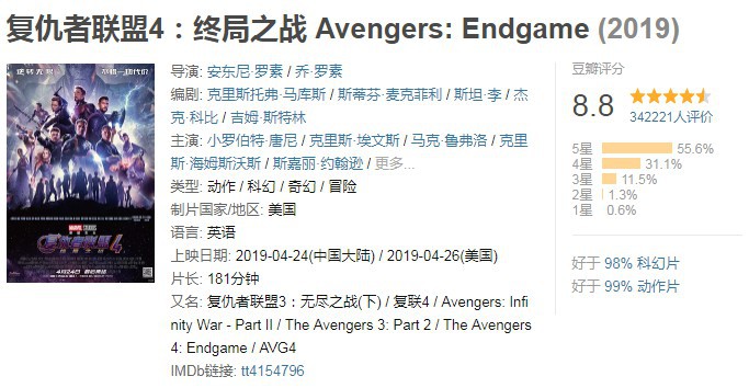 目前,该片在豆瓣评分为8.8分,烂番茄新鲜度96%,MC均分77。但无论评分高低,若是追了这么多部漫威电影,这部总结性的电影还是值得一看。你看过了吗?