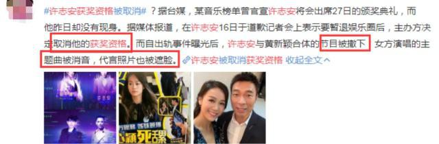 记者获悉,由于偷腥事件的发酵,加之此前许志安在4月16日举行的发布会上表示将暂时退出娱乐圈,组委会决定了取消许志安的获奖资格,27日晚的“榜中榜”活动中,许志安并未出现在颁奖礼中,由于此前组委会仅公布了许志安将出席颁奖礼,并未公布其所获得奖项名称,因此无法确定其原本将获得的奖项名称以及由哪位艺人顶替获奖。