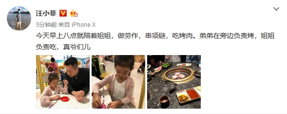 4月27日晚,汪小菲在微博晒出一组照片,配文:“今天早上八点就陪着姐姐,做劳作,串项链,吃烤肉。弟弟在旁边负责烤,姐姐负责吃,真爷们儿!”照片中,汪小菲陪着女儿坐在桌子旁,看着她串手链,认真的模样宛如小公主。遭网友调侃:“弟弟不配拥有照片吗?”