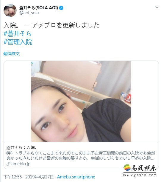 苍井空老师更新了自己的Ameba博客状态,苍老师在博文中表示已经入院待产,四天后将进行剖腹产手术。
