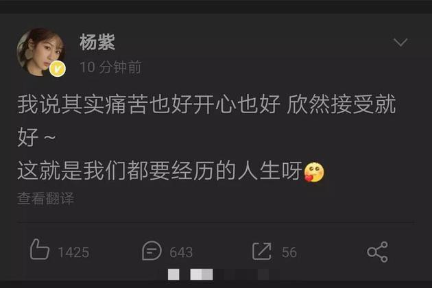5月24日,杨紫深夜发微博写道:“我说其实痛苦也好开心也好,欣然接受就好,这就是我们都要经历的人生呀”,10分钟后,杨紫又删除了该条微博。杨紫工作室也转发了该微博,并配文称:“早点睡觉也是要尽快去经历的”,配文下面则显示此微博已被作者删除。