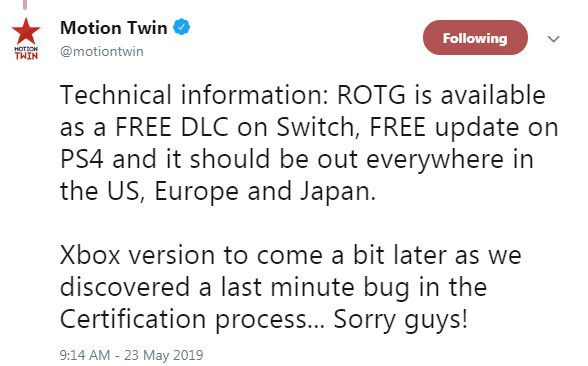 官方在推特中表示,玩家现在可以在Switch以及PS4平台免费更新这款DLC,而由于在认证过程中发现了一个bug,Xbox版本将会推迟一段时间推出,官方也向粉丝表达了歉意。