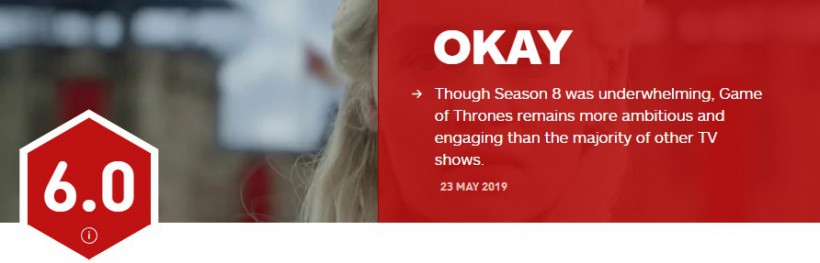 在《权力的游戏》第八季第一集播出时,IGN为《权力的游戏》第八季的首秀打出了8.0分的临时评分,现在《权力的游戏》第八季已经正式完结,IGN为整个《权力的游戏》第八季给出了6.0分的评价。