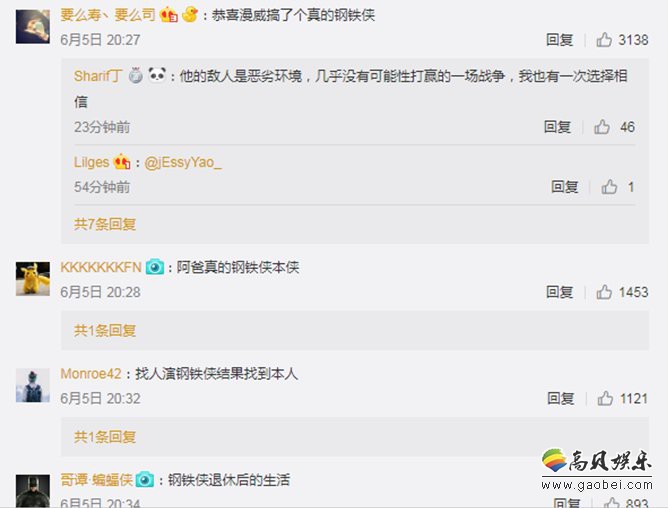 为此广大网友直呼“恭喜漫威搞了个真的钢铁侠”,可见唐尼对于钢铁侠本身的理解并且以自己身体力行的能力来为地球环境做着贡献,是网友们喜闻乐见的。