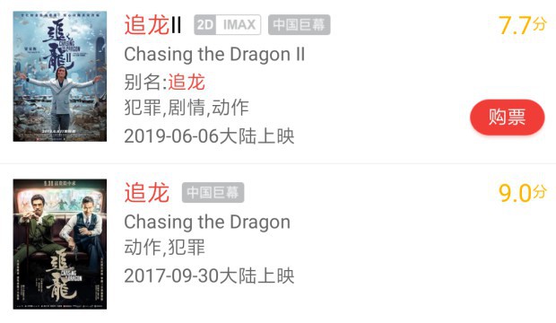 《追龙2》在各大平台的观众分数都要低于前作,猫眼上《追龙1》有着9.0的高分,《追龙2》却只有7.7分,淘票票上的分数相差不大,《追龙》8.8分,《追龙2》8.5分,豆瓣上《追龙1》7.2分,《追龙2》6.3分。