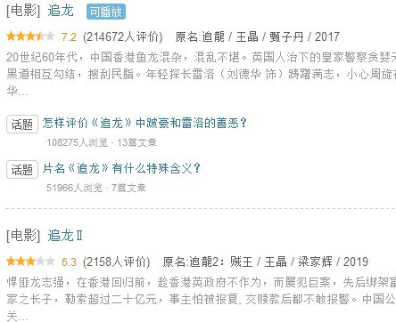 《追龙1》讲述了60年代跛豪与雷洛的故事,《追龙2》则将背景搬到了香港回归前,聚焦贼王,虽然评分上不敌前作,但仍有不少影迷对《追龙2》中诸位影帝的演技给予了好评。