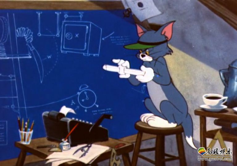 不过,不要以为汤姆只是一介莽夫,汤姆的头脑也很聪明,在剧集《捕鼠陷阱》中,汤姆设计了一个相当神奇的毕达哥斯拉装置,不但画了完美的草图,设计了整个装置的传动,还精确计算了保险箱最后掉落的位置。虽然最后因为工图的数据被修改,导致保险箱砸在了自己的头上,但足以看出汤姆在物理学和数学上的能力之高。