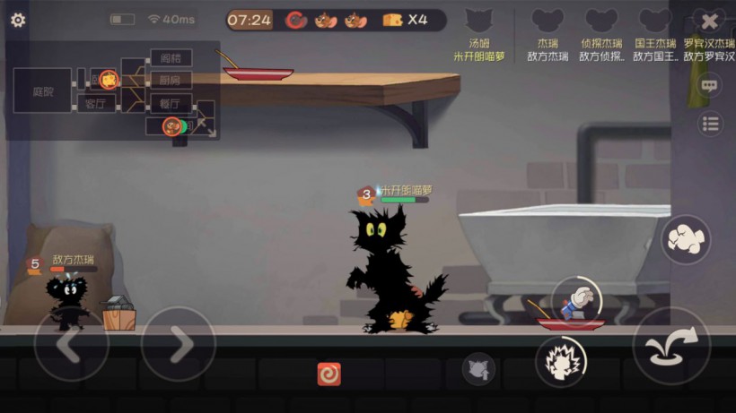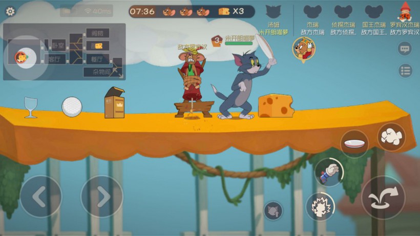 在游戏中,汤姆虽然不在“石乐志",但要同时面对四只杰瑞,双方依靠道具斗智斗勇,战胜对方。杰瑞要想办法把一定数量的奶酪运进洞里,而汤姆则要打晕他们并趁机绑在火箭上送上天。这是一种典型的非对称对抗玩法,正是由于人数不对等,才让战局出现很多变化。但无论怎么变化,双方在技能强度和获胜几率上,都处在微妙的平衡中。