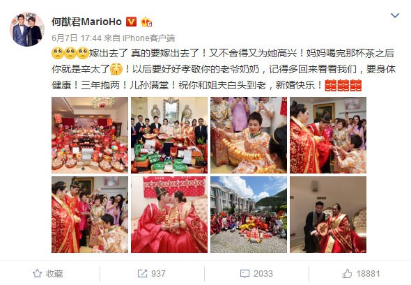 6月7日,何猷君晒出一组姐姐何超盈过大礼仪式的照片。何超盈挺着孕肚,穿着厚重的中式礼服。照片更是曝光了何超盈男友送的一众聘礼。据悉,仪式是由何鸿燊亲自题选,全部遵照传统中华文化传统,中文讲究,场面相当豪华。何猷君也配文表达不舍与祝福:又不舍得又为她高兴!妈妈喝完那杯茶之后你就是辛太了!