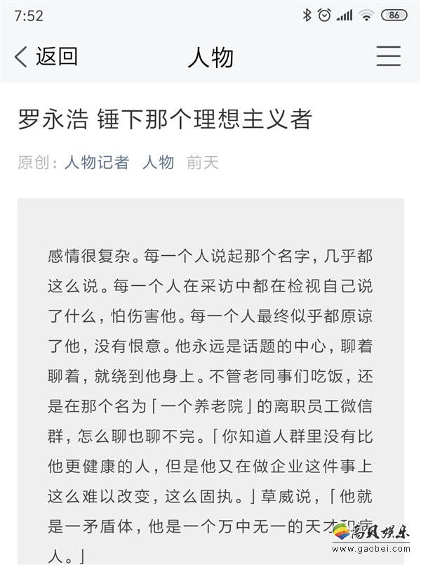 此前“人物”在其微信公众号上发表了一篇名为《罗永浩 锤下那个理想主义者》的文章。近日罗永浩在微博发长文回应这篇文章。