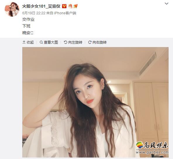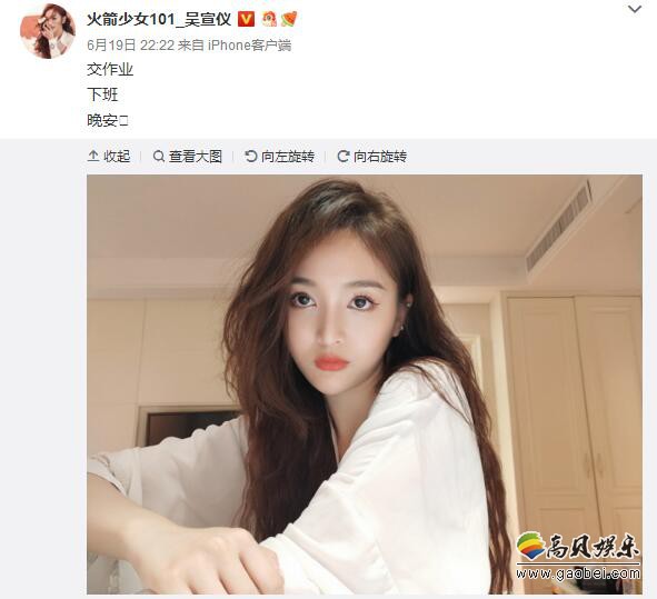 19日晚,火箭少女101成员吴宣仪收工后发九宫格自拍营业,并配文写道:交作业,下班,晚安。照片中,吴宣仪摆出各种pose,营业能力满分!