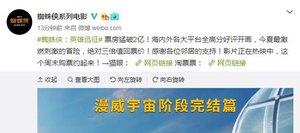 今天《蜘蛛侠:英雄远征》刚刚上映,零点场2170万的成绩,让它成为影史单人超英电影第一。截止今天中午,票房就已经突破1亿,而不到10个小时的时间里票房再翻了一番,官方还公布了新的海报来庆祝此事。更何况今天还是工作日,随着周末的开始,这个势头恐怕还要更凶,不知道今晚有没有机会突破3亿。