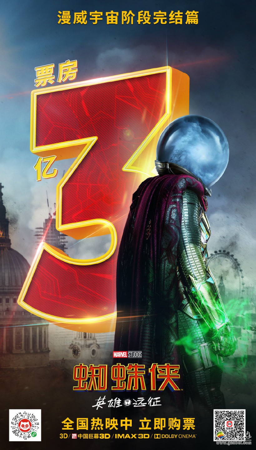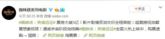 今天(6月29日)蜘蛛侠系列电影官方微博公布:《蜘蛛侠:英雄远征》票房突破3亿的宣传海报,影片剧情笑泪交织全程高能!超震撼视效颠覆想象极限!漫威宇宙阶段完结篇。