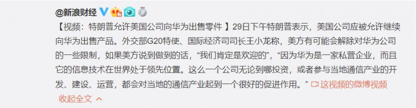 特朗普表示,华为购买的产品是美国硅谷生产的很复杂的产品,这些美国公司很伟大,会带动就业,所以允许美国企业继续卖产品给华为。