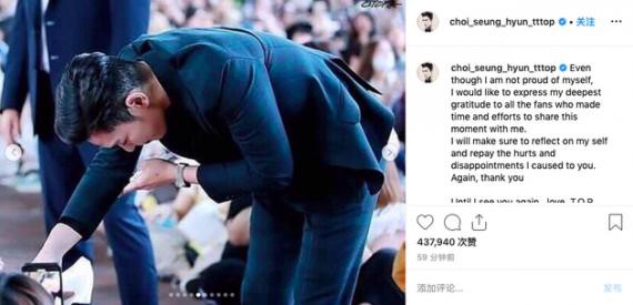 7日,BIGBANGT.O.P崔胜贤通过社交网站向粉丝表达了歉意和感谢,“虽然我无法堂堂正正的面对自己,但想对帮助我度过这一瞬间的粉丝们表示深深的感谢,以后将继续反省,会怀着因给粉丝带来伤痛和失望而抱歉的心情生活。”