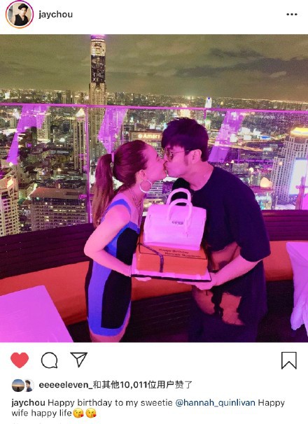 8月13日昆凌生日,周杰伦在个人社交平台上晒出自己与爱妻昆凌的亲吻照,甜蜜为其庆生,并配文:“Happy birthday to my sweetie。 Happy wife happy life”照片中二人手捧蛋糕,昆凌一脸幸福微笑。