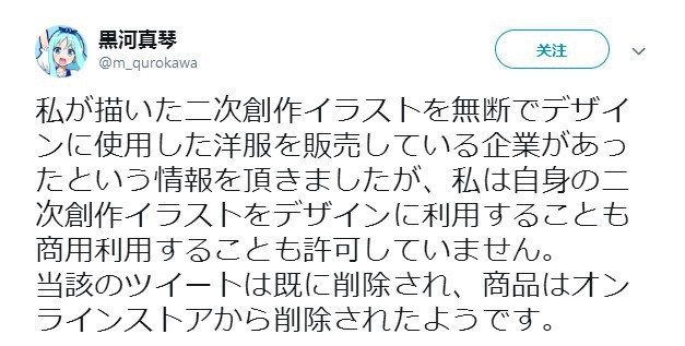 “有人告诉我某家公司用了将我基于版权角色的二次创作擅自用在衣服上,我并没有允诺他们将我的二次创作用于设计或商品”