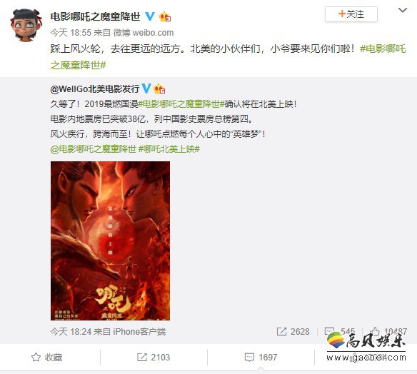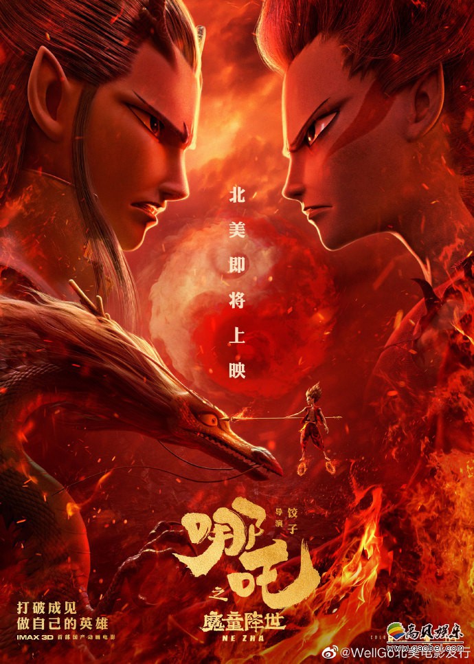 《哪吒之魔童降世》确认将在北美上映,官博发文表示:“踩上风火轮,去往更远的远方。北美的小伙伴们,小爷要来见你们啦!”