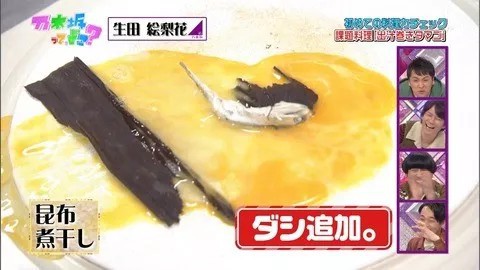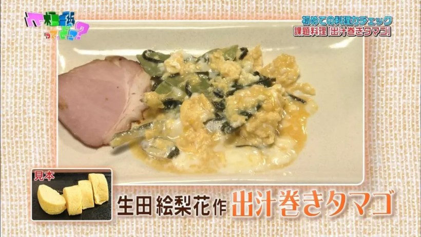 最让人印象深刻的是在早期的节目中,生田被要求做一道高汤鸡蛋卷,结果没进去过厨房的她,居然直接把打好的蛋放进电磁炉中,并在糊糊的蛋上加进海带和小鱼干。