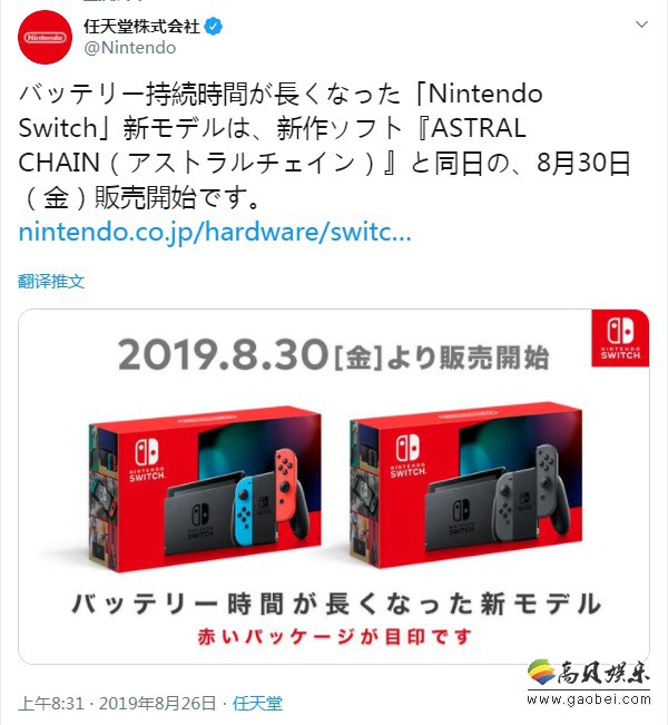 任天堂日本官方推特近日发布公告,宣布日版续航强化任天堂Switch将于8月30日与白金工作室的新作《异界锁链》同日发售,另外任天堂Switch Lite也将于于8月30日开启预约。
