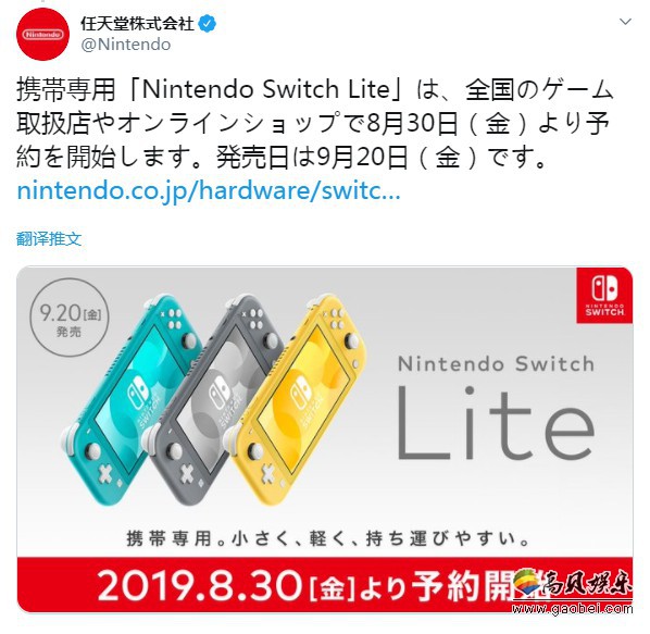 根据此前官方公布的消息,任天堂Switch Lite将于9月20日正式发售,感兴趣的朋友可以前往任天堂官网了解更多详情。