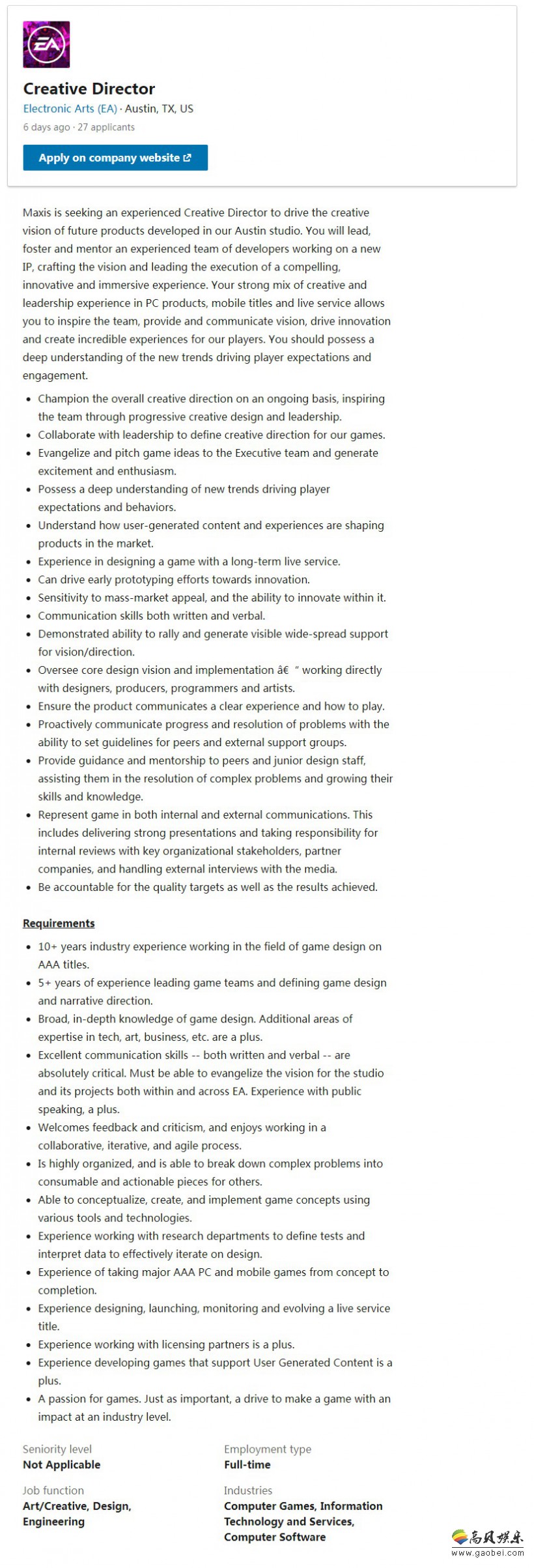 据linkedin招聘页面显示,EA正在为《模拟人生》系列的开发商Maix招聘新的创意总监,并且将负责带领团队开发新IP。