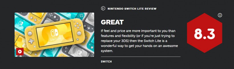 IGN为Nintendo Switch Lite给出了最终评分8.3分,IGN的编辑认为NS Lite提供了一种更便宜、更有吸引力的方式来玩Switch游戏。