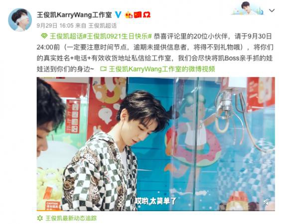 9月29日,王俊凯工作室发布一则王俊凯夹娃娃的视频,并配文表示,将王俊凯夹到的娃娃,作为20岁生日的回礼送给粉丝。视频中,王俊凯身穿棋盘格子卫衣,在娃娃机前动作十分娴熟地夹了各色不同的20个玩偶,并表示要将玩偶全部送给粉丝。