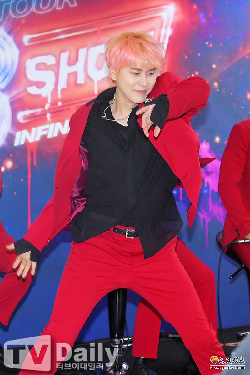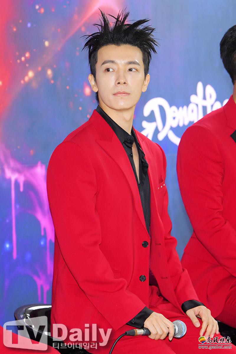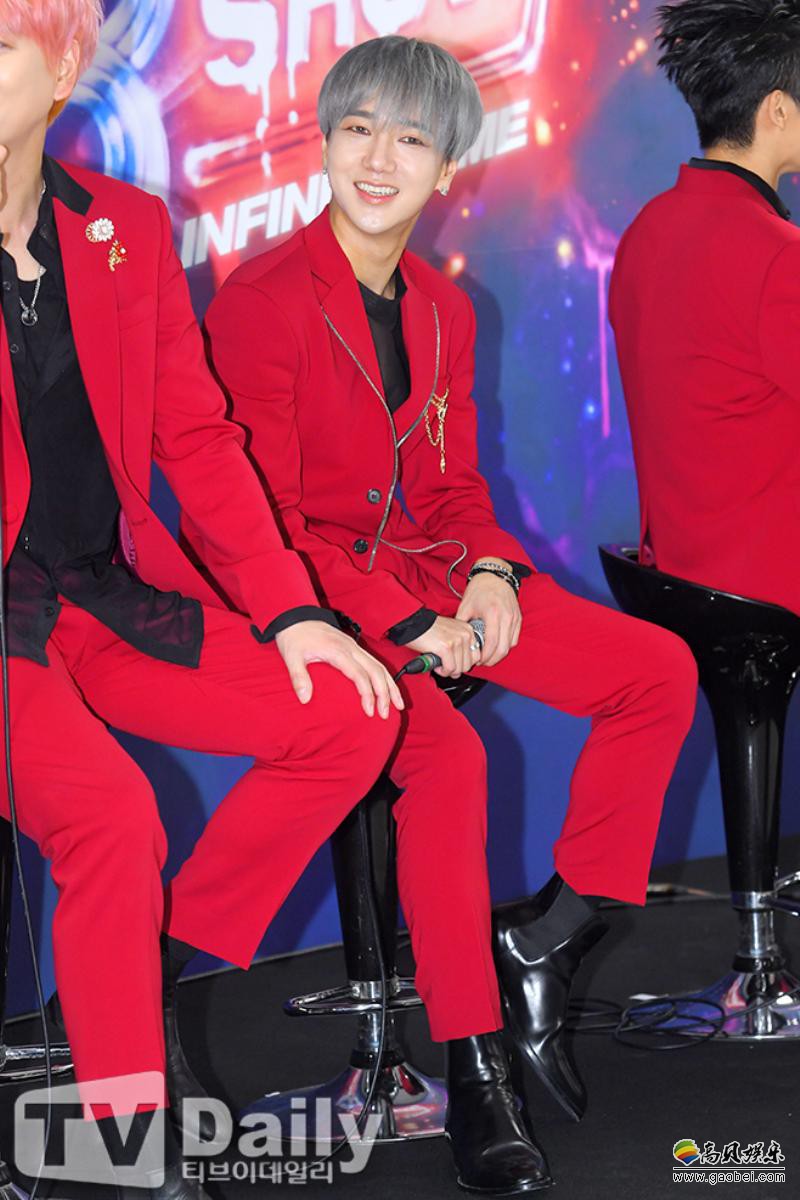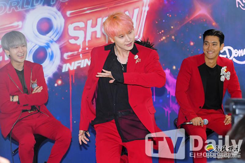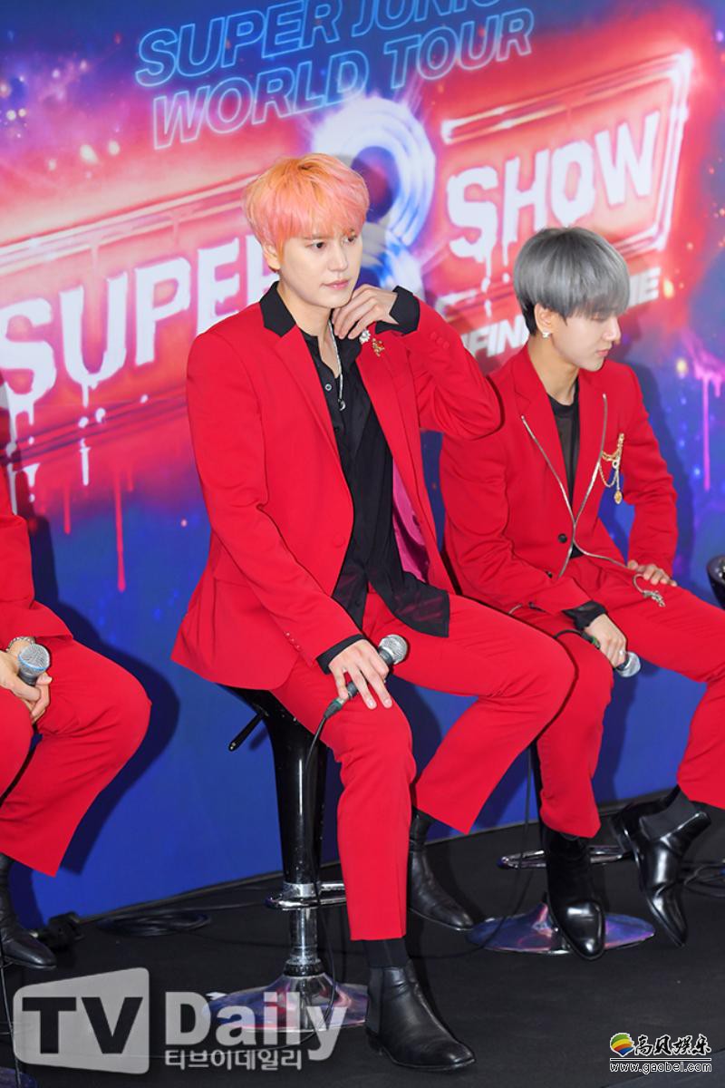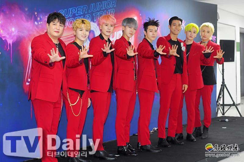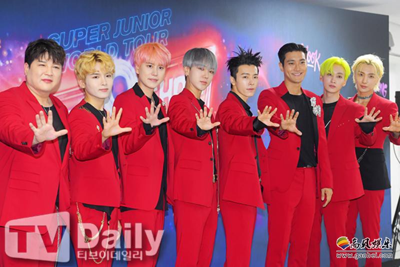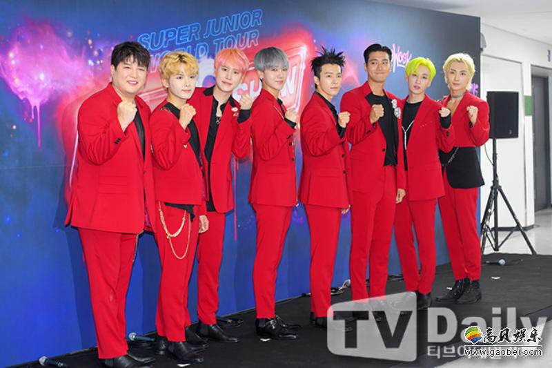 今日(13日)下午,Super Junior出席位於首尔松坡区所举行的《Super Junior WORLD TOUR - SUPER SHOW 8 : Infinite TIME》演唱会之记者会,全员以红西装酷帅登场,并摆出招牌姿势拍摄团体照。