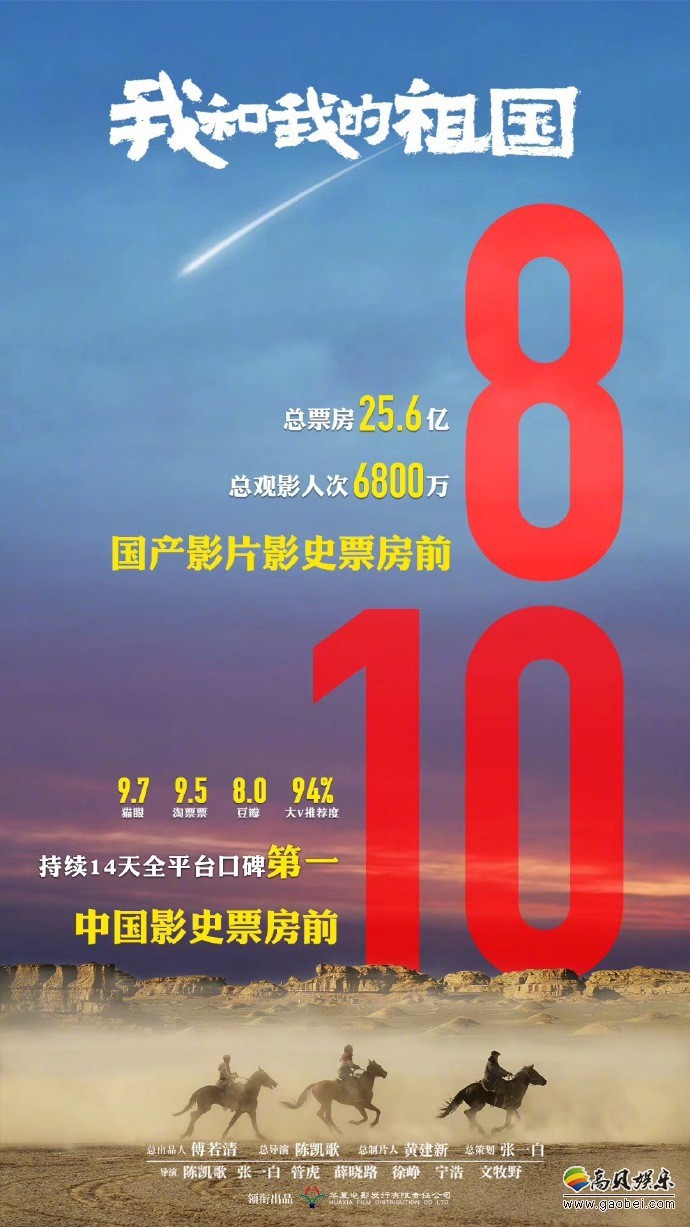《我和我的祖国》总观影人次达6800万,国产影片影史票房前8,中国影史票房前10,持续14天全平台口碑第一。