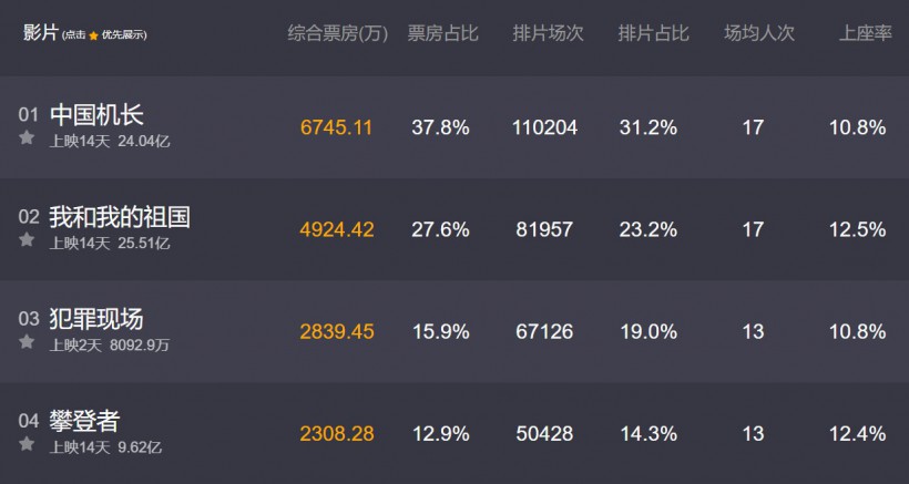 此外猫眼票房显示,另外两部国庆档电影《中国机长》票房24.04亿,《攀登者》票房9.62亿。