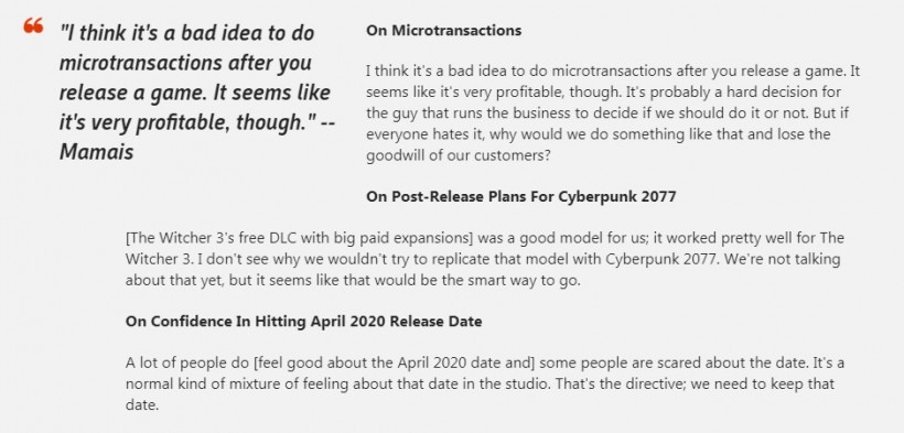 在采访中Mamais表达了对微交易机制的反对“我觉得在游戏发售后加入微交易是个坏主意,即使这看上去利润颇丰。可能对于运营企业的人而言,是否加入微交易这样的决定很困难。但是,如果所有人(玩家)都讨厌这种事的话,为什么我们要为此牺牲玩家们的好感呢?”
