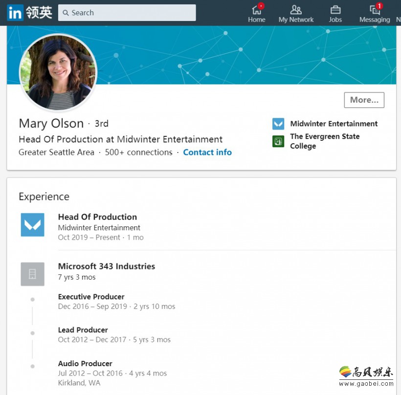 本则消息最早由ResetEra论坛网友“Modiz”曝光,据他所言,从Olson领英页面的个人信息来看,Mary Olson自十月开始在Midwinter娱乐工作室就任制作负责人一职。而此前曾在343工作室就职,担任《光环5》负责人的Josh Holmes目前也是在Midwinter工作室负责制作与设计工作。