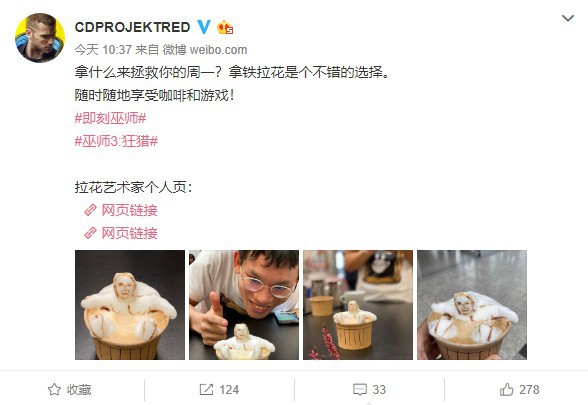 @CDPROJEKTRED官博今日分享了拉花艺术家george_10g制作的拿铁拉花,造型是我们十分熟悉的一个经典场景——《巫师3》开场的杰洛特泡澡。