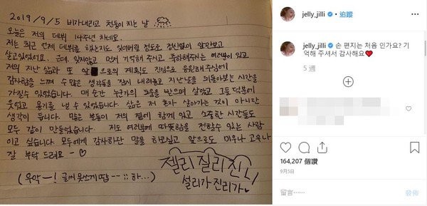 雪莉感恩的说,“每一瞬间获得某些人的帮助而活着,因为托他们的福笑着并获得了勇气,让我感受到人生在世并不是只有一个人度过,许多人一直在我的身边,也一起创造了很多珍贵的时光,我想成为带给大家温暖的人,想对大家说谢谢,未来就算是讨厌或是喜欢都拜托大家了。”结尾还嘲笑自己的字迹太丑,没想到却是她第一封公开、也是最后一封手写信。