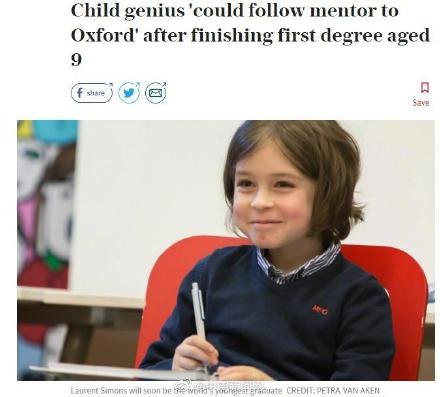 外媒报道,比利时一位9岁男孩劳伦•西蒙斯将在今年年底大学毕业,打破世界纪录成为史上最年轻大学毕业生。