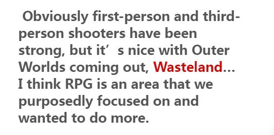 他表示现在看到RPG发展得越来越好也让他十分自豪,而曾经《质量效应1》等作品也让他认为RPG是一个非常重要的类型。“显然第一人称和第三人称射击游戏一直都表现得很强势,但是看到《天外世界》这样的作品诞生也是很不错的、还有《废土》...我觉得RPG是我们现在应该决心专注的领域、并且我们也想做得更多。”