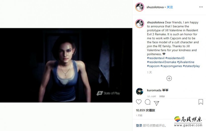 “亲爱的朋友们,我很高兴地宣布,我成为了《生化危机3:重制版》中吉尔的原型。我很荣幸能和Capcom一起工作,成为这个角色的脸模,并加入《生化危机》家族。感谢吉尔的粉丝们,感谢你们的善意和礼貌。”
