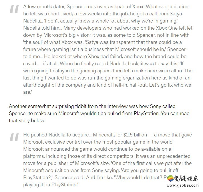 在这之后,微软收购了《我的世界》、推出了Xbox One X,然后接着收购了数不胜数的工作室。在收购《我的世界》时,还发生了一段小插曲。据Spencer所说“当时我们最先收到的电话中,就有来自索尼的‘你们会让它从PlayStation上下架吗?’而我给出回复大概是‘我们为什么要那样做?人们喜欢在PlayStation上玩它。’”