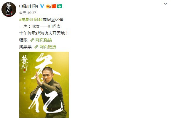 @电影叶问4官方微博今天发布公告,宣布电影《叶问4》票房已经突破3亿。官方也发布了一张3亿贺图,一起来欣赏一下。