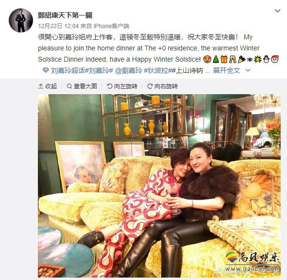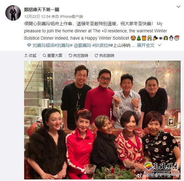据香港媒体报导,刘嘉玲前晚(12月21日)相约圈中好友狄波拉与老公江耀城(胡须Kong)、甄楚倩、上山诗钠、张叔平等,在家中提前吃冬至饭,开心相聚。公关郑绍康在社交网上载多张众人在饭局的合照,留言表示到刘嘉玲家中作客吃冬至饭,刘嘉玲与拉姑及胡须Kong都穿着红色衣服,充满喜庆气氛,但照片中未见梁朝伟。