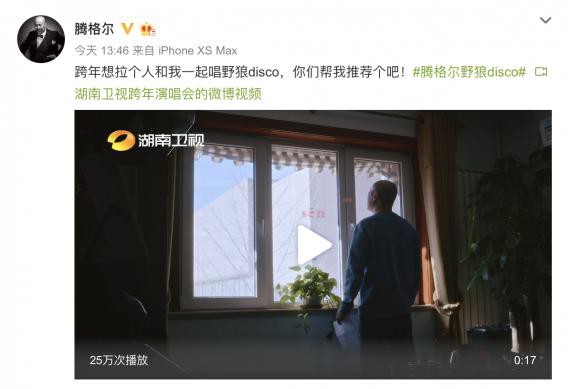 昨日,湖南卫视跨年演唱会率先发布腾格尔个人宣传片,视频中,草原天籁腾格尔遇上神曲《野狼Disco》,唱着“sen lei de fa…”,#腾格尔野狼disco# 让不少网友大呼魔性。而腾格尔本人也是在社交平台在线征集合唱搭档,有网友留言推荐刘宇宁:“刘宇宁唱过野狼,东北腔好听”,而腾格尔老师到底是和网传的吴亦凡一起合唱《大碗宽面》,还是会接受网友的意见与刘宇宁搭档演绎《野狼Disco》呢?让人好奇。