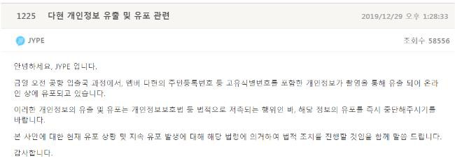 下午JYP迅速发布公告:「在今日上午机场出国过程中,多贤的身份证号等固有识别号码包含在内的个人资料被拍摄泄露,正在网上传播。这种泄露和散播个人资料的行为触犯了个人资讯保护法等,请即时停止。」并警告会采取法律措施。