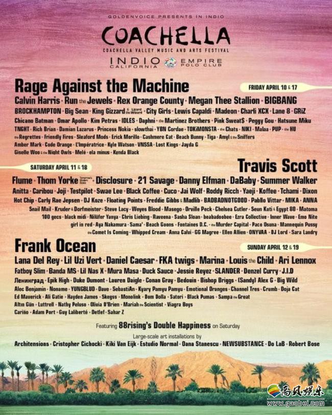 2020 Coachella Valley Music and Arts Festival近日在官方推特发布了今年的出演阵容名单,BIGBANG与Calvin Harris,Rex Orange County等歌手名列其中,受到了全球粉丝的关注。