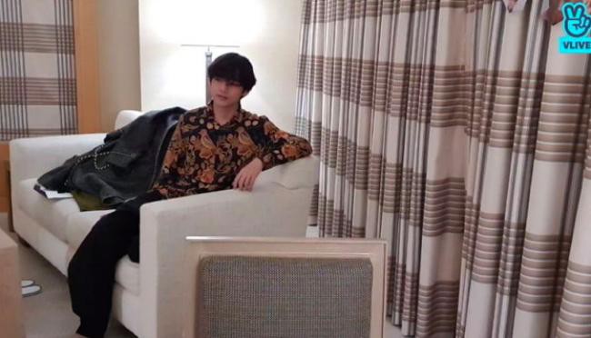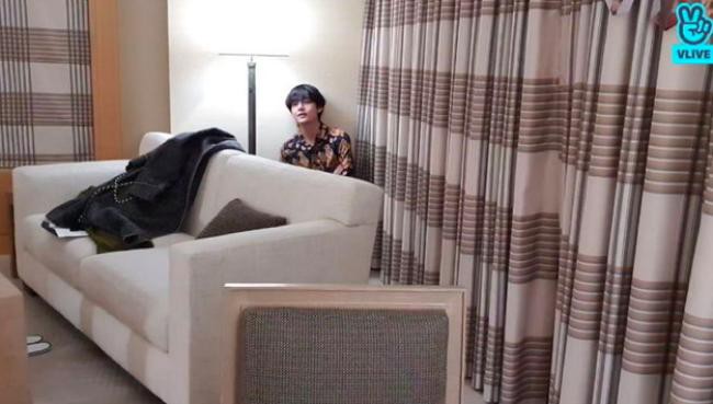 然而要求严格的V仍旧不满意画面中的自己,一直往后退,先是退到了沙发,接著又退到了沙发的后面的落地灯旁,傻傻地蹲在角落里,一脸无辜的表情。