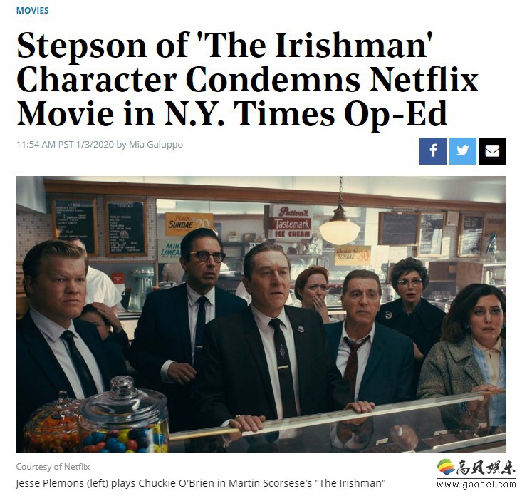 马丁·斯科塞斯的新片《爱尔兰人》中涉及到真实人物吉米·霍法(阿尔·帕西诺饰演),以及霍法的养子Chuckie O'Brien(杰西·普莱蒙饰演),而据外媒THR报道,近日现实中的Chuckie O'Brien的继子Jack Goldsmith在《纽约时报》发文,强烈指责《爱尔兰人》,称这部电影是“迄今为止对我继父最大的错误指控”,Chuckie本人在观看过《爱尔兰人》后也对影片中不符事实的描述大怒。