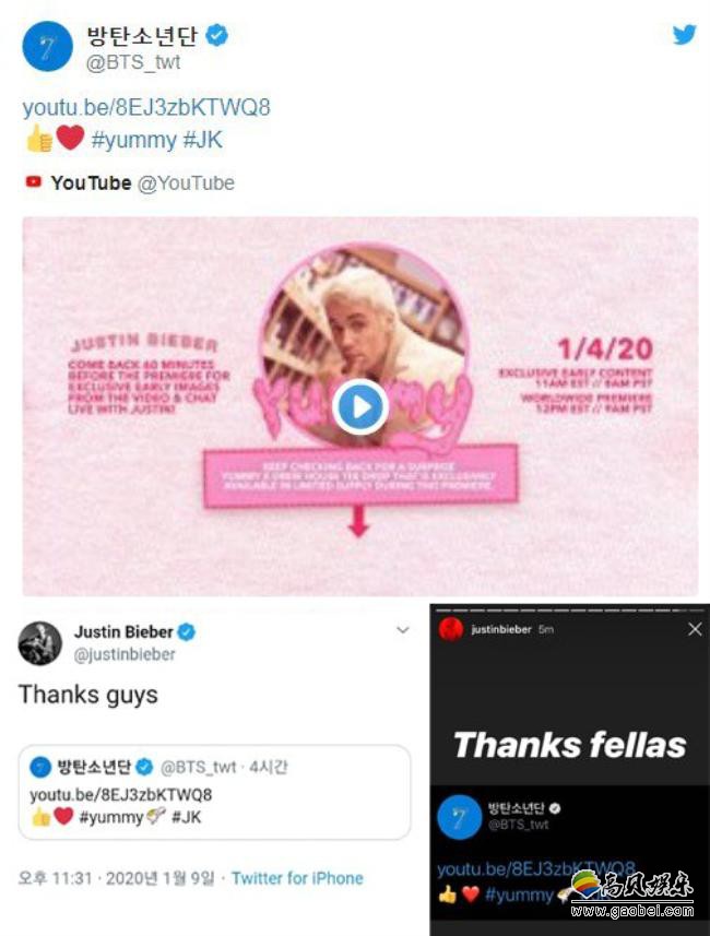 9日晚,田柾国通过防弹少年团推特发布了一则帖子,帖子中包含了贾斯汀比伯的新曲《Yummy》MV链接,并发布了话题。随后该话题在全世界39个国家地区登上了流行趋势的第一位。而贾斯汀比伯随后在帖子下留言道谢,并在instagram上也截图了相关推特,再次表示了感谢。