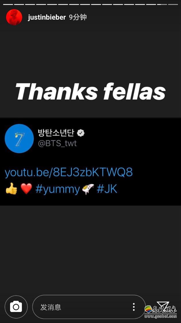 韩国人气组合防弹少年团成员田柾国通过SNS为贾斯丁比伯宣传新曲。
