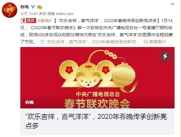 1月24日(大年三十),《2020年春节联欢晚会》将隆重举办。昨日,春晚第一次彩排在中央广播电视总台一号演播厅顺利完成。