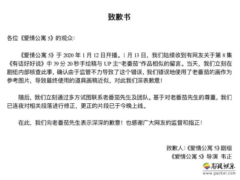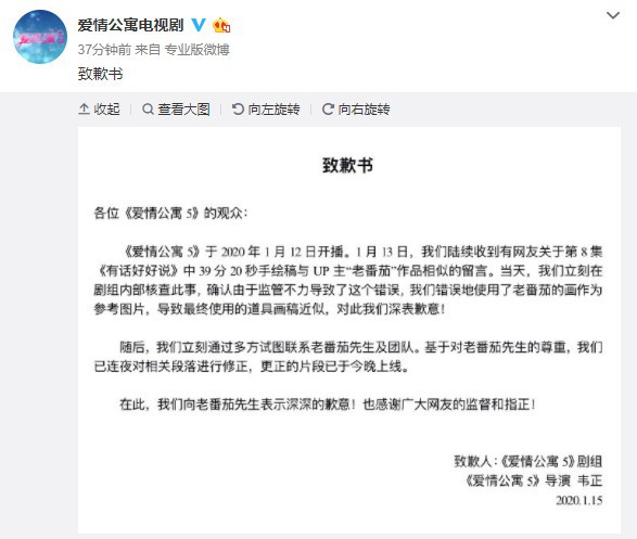 今天@爱情公寓电视剧官方微博发布了一封致歉书。在公告中,《爱情公寓5》剧组表示:由于监管不力,错误地使用了UP主“老番茄”的画作为第8集中手绘稿的参考,导致最终使用的道具画稿近似。对此剧组也表达了歉意。
